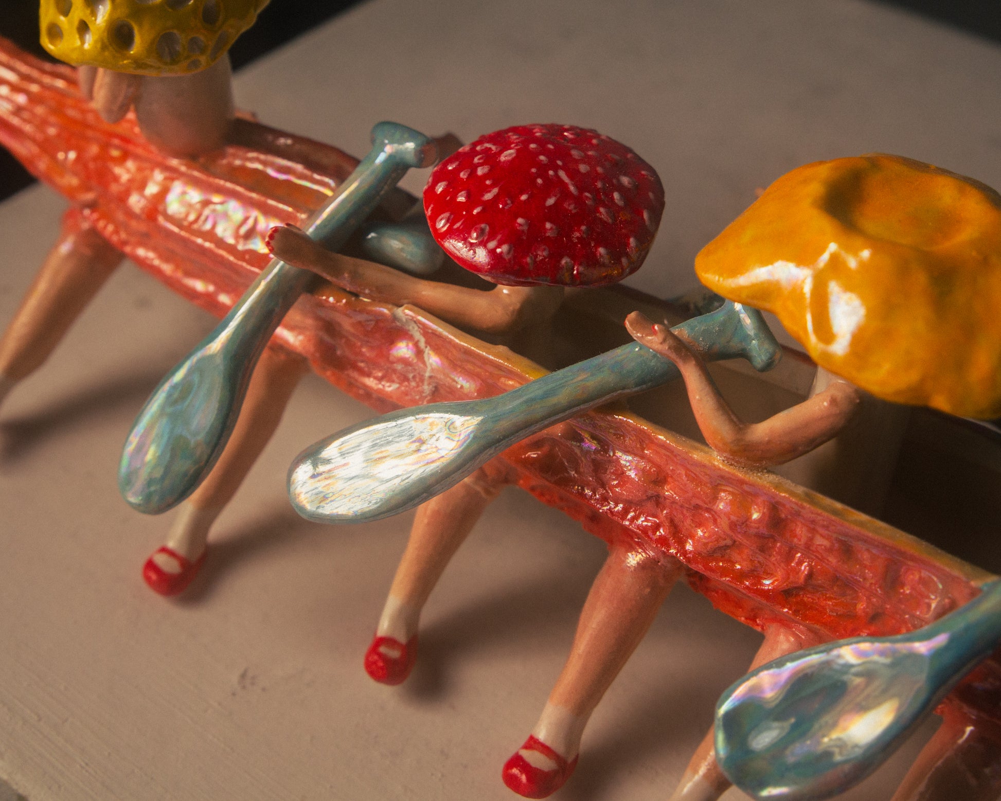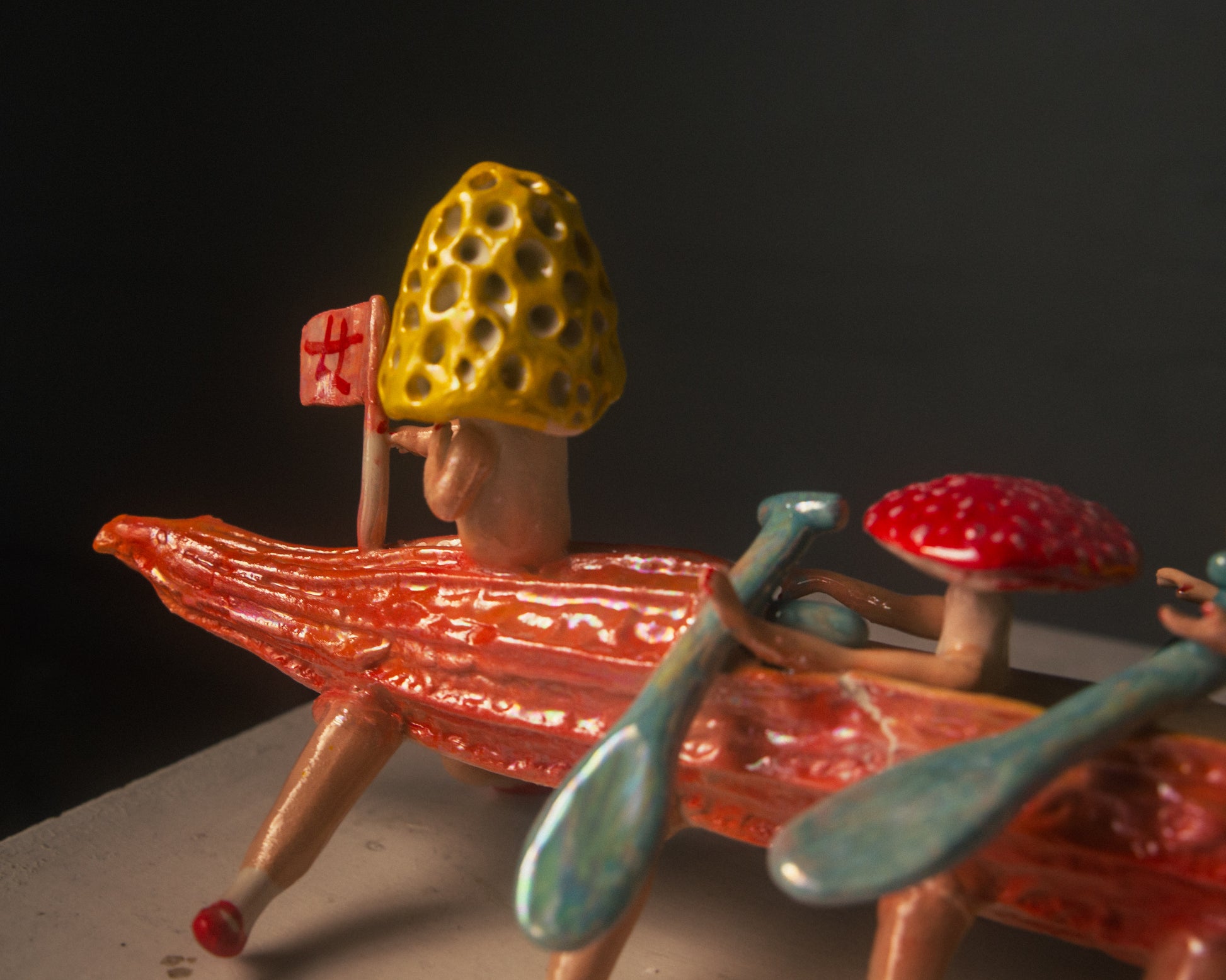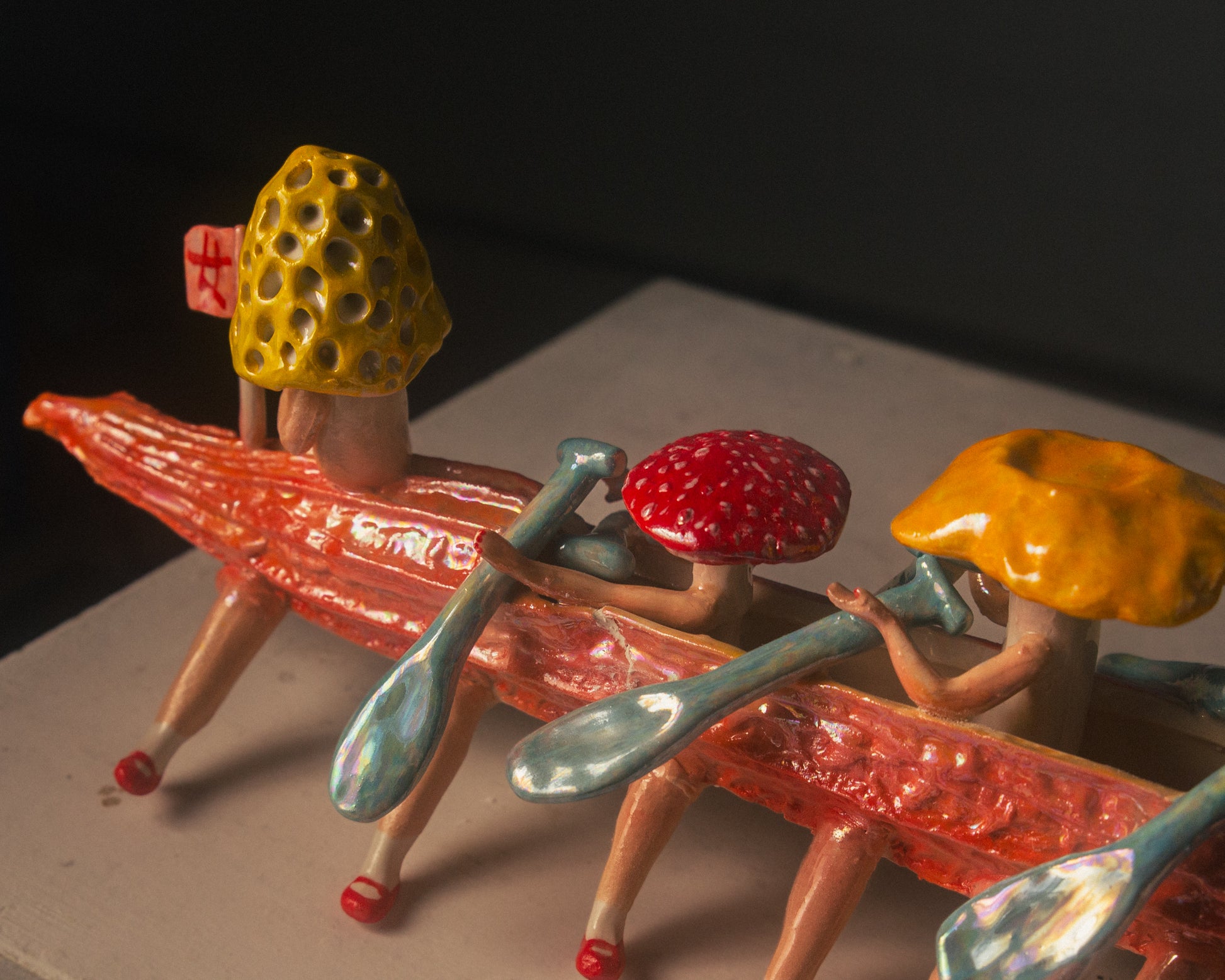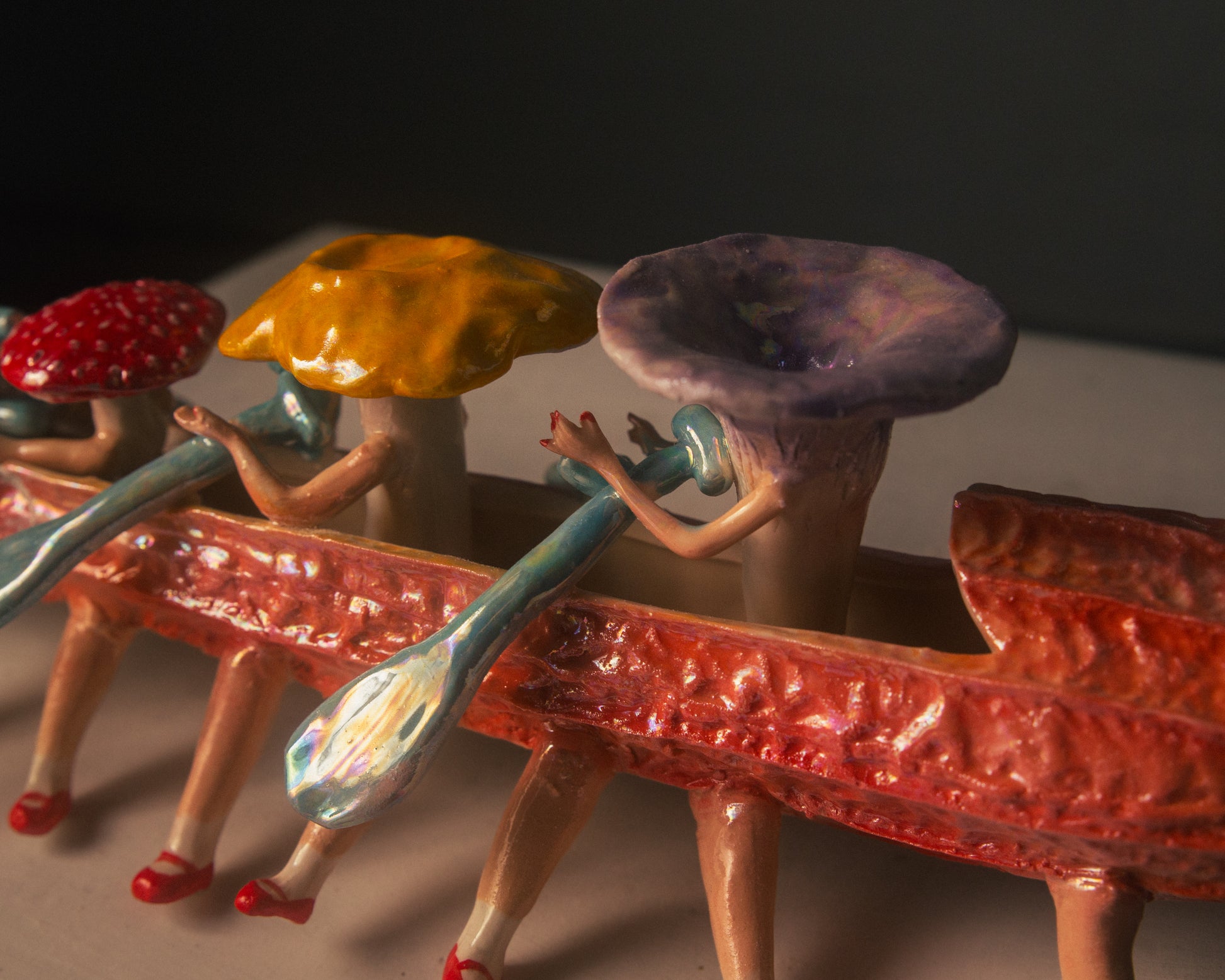Each piece begins with a fresh vegetable luffa, used to create a plaster mould for slip casting the boat's body. The whimsical mushroom-like legs are hand-built and attached, giving the boat its own unique character—grounded yet ready to sail.