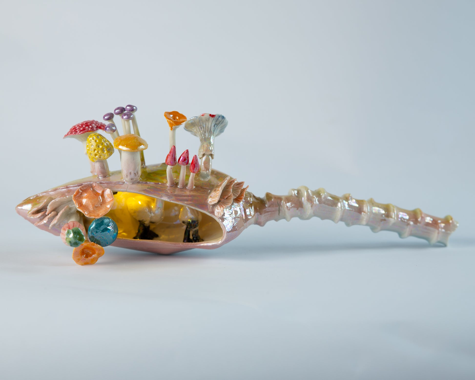 Banana Flower showcase a plaster mold crafted from a real banana flower, creating a one-of-a-kind textured design. The banana flower shines with a glossy, iridescent finish that sparkles beautifully when it catches the light. This are pices is also a lamp, there will be a little led battery lighr come with it , and you can put in the flower.